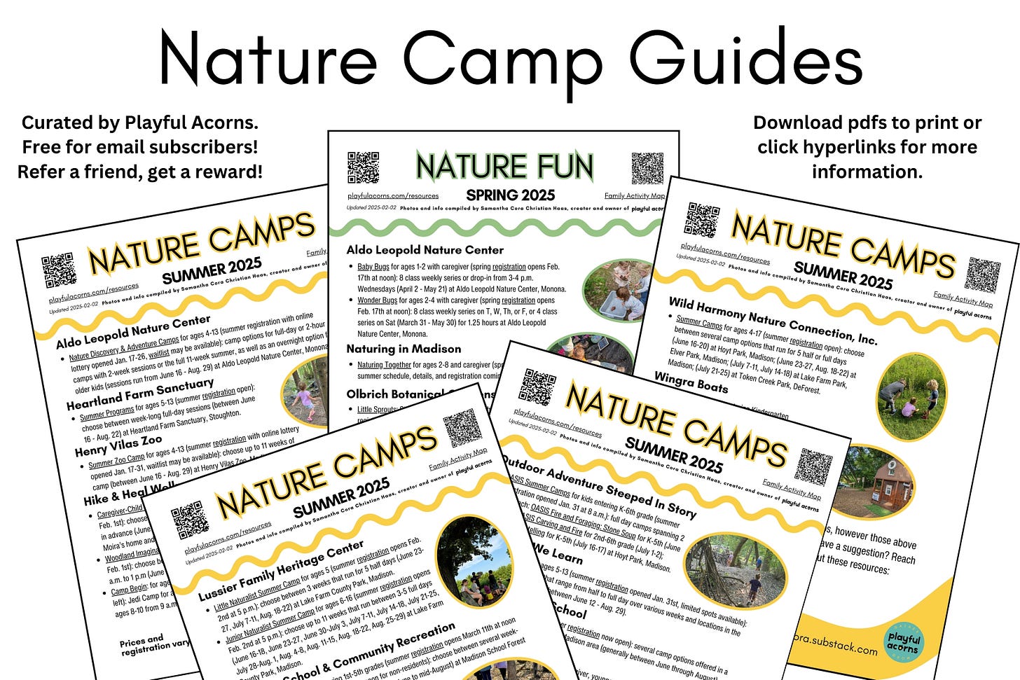 I have also been trying to spend less time on social media and more time creating art and writing. That brings me to my next project and offering for you all. Although Z is not old enough for summer camps yet (most start at age 4 or 5), many of my friends are realizing that registration deadlines are upon us. I did some digging and created a Spring 2025 Nature Fun Guide for kids ages 0-5 and their caregivers as well as a collection of Summer 2025 Nature Camp Guides for kids of all ages. These resources are available just for you, our email subscribers, but I’d love if you could share this publication to spread and the word! Remember, you can earn some neat rewards*!
